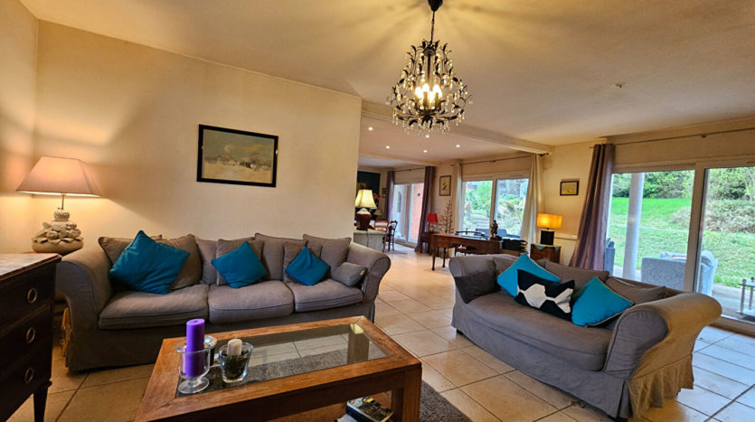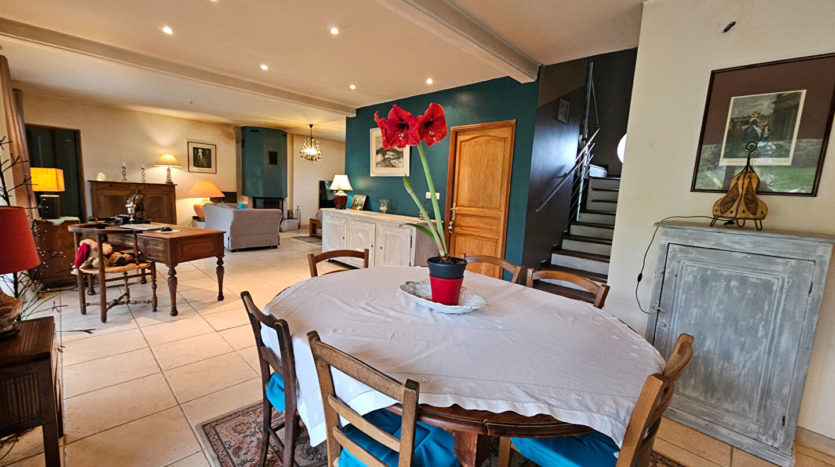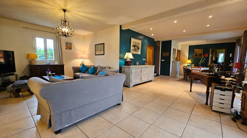 Une cuisine aménagée et équipée, ouvrant sur un cellier, un vaste séjour double de 65 m², un bureau, une suite parentale et des WC séparés.