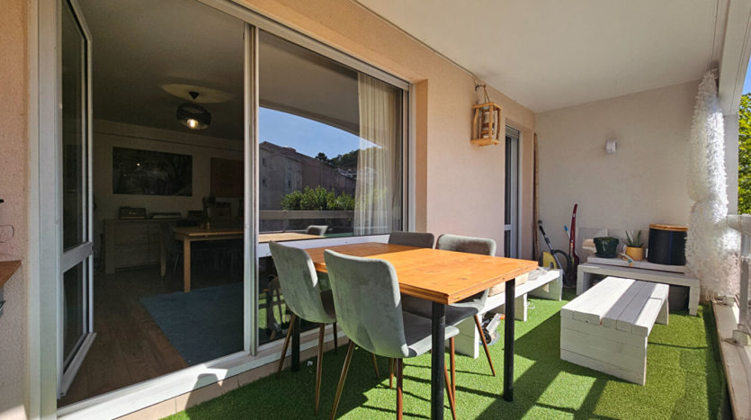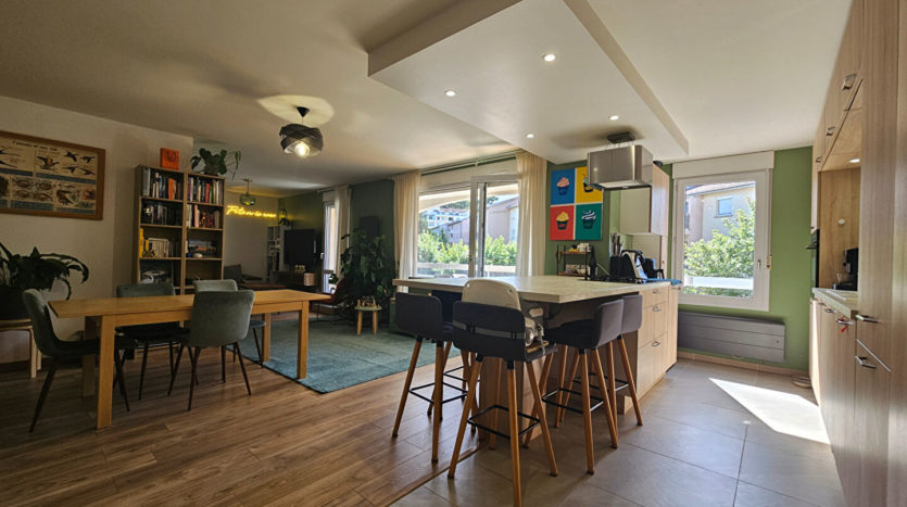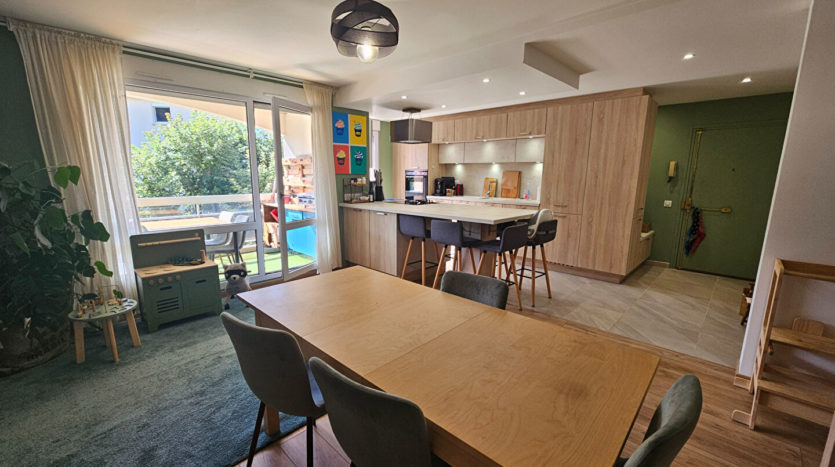 Il se compose d’une grande pièce de vie avec cuisine ouverte aménagée et équipée avec îlot central, un espace salon et salle à manger donnant sur un balcon exposé Sud.
