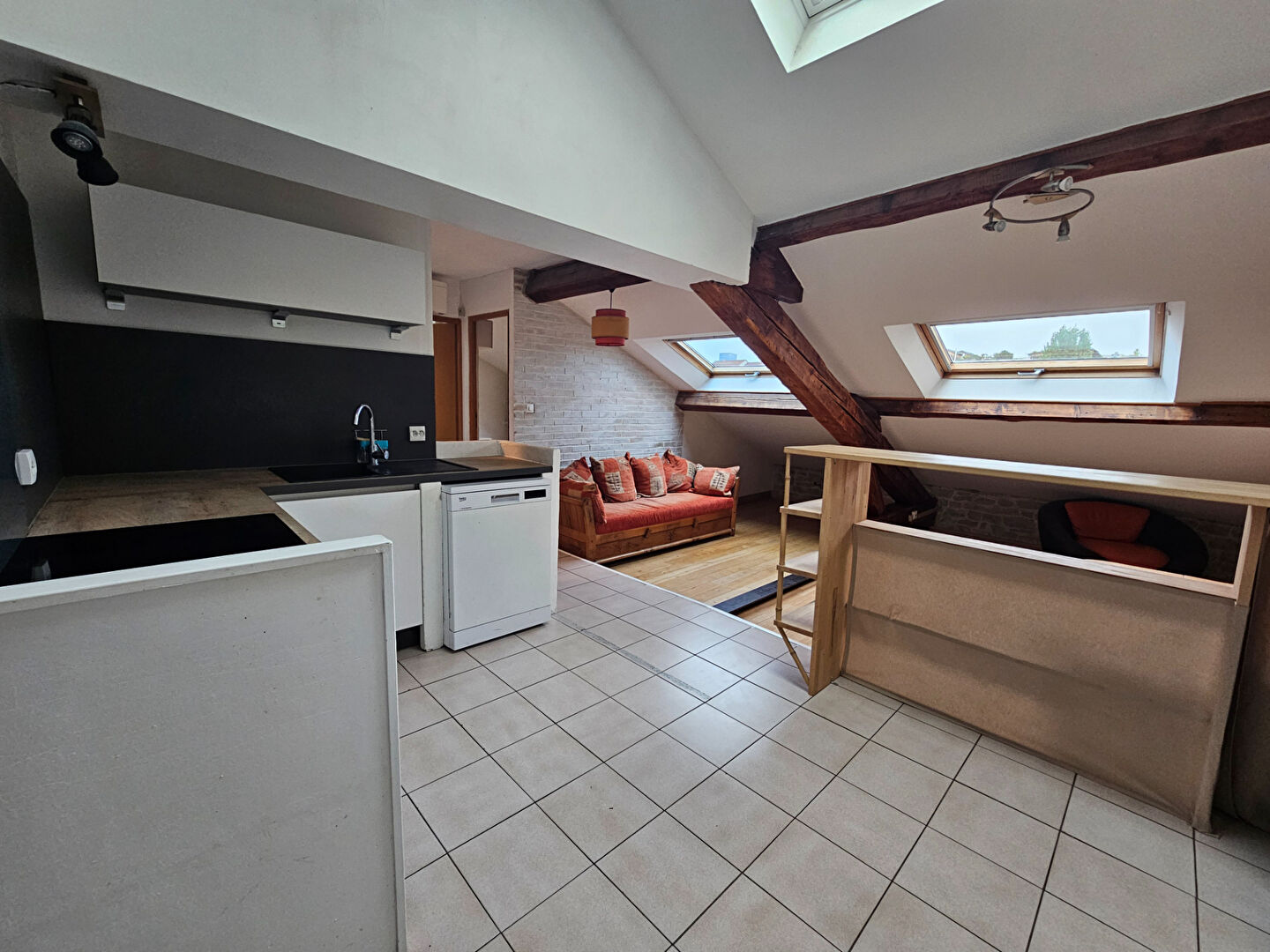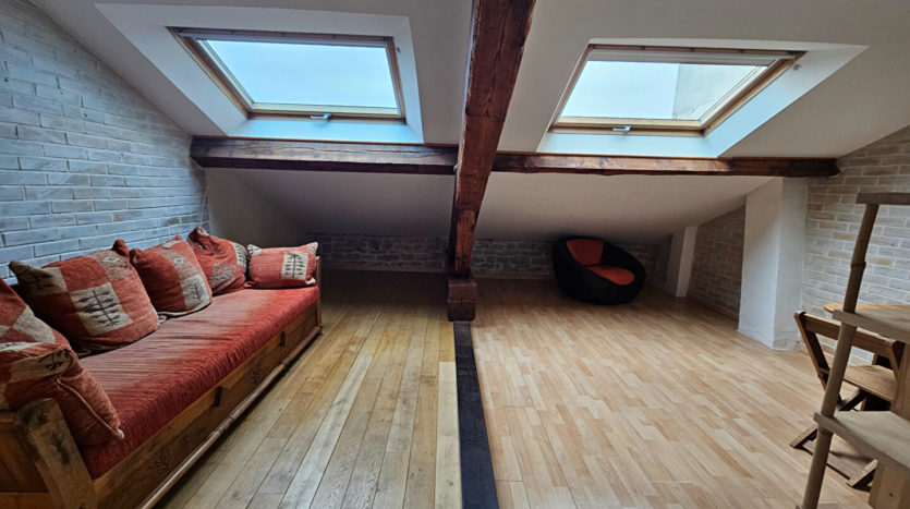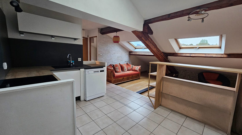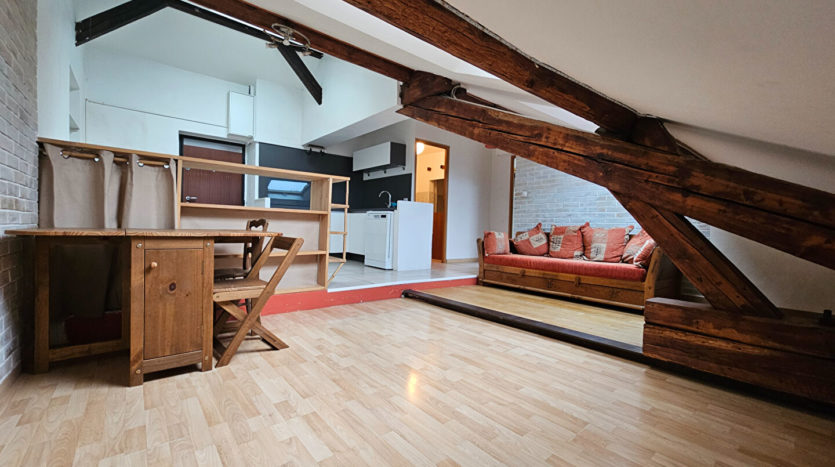 39, rue Hippolyte Kahn, au 2ème et dernier étage sans ascenseur, T2 de 65 m² dont 42 m² en loi Carrez comprenant pièce de vie avec cuisine aménagée ouverte sur séjour, SDB avec WC, et chambre avec mezzanine.