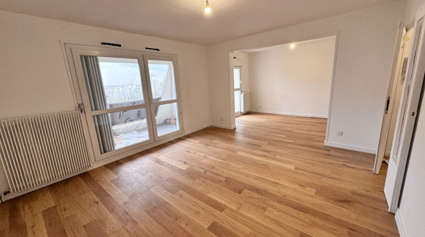 Avenue Roberto Rosselini, au 12ème et dernier étage d’un immeuble de 1988, T4 traversant entièrement rénové comprenant entrée, cuisine équipée neuve, séjour double donnant sur balcon, dégagement, deux chambres, SDB, WC séparés, buanderie et balcon.